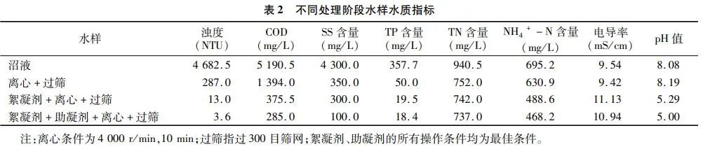 為了驗(yàn)證最佳條件下的絮凝效果,以最佳的絮凝條件進(jìn)行試驗(yàn),表2列出了每個(gè)步驟的出水水質(zhì)指標(biāo),沼液原樣的濁度、COD、SS含量、TP含量、TN含量、NH4+-N含量分別為4682.5NTU、5190.5mg/L、4300.0mg/L、357.7mg/L、940.5mg/L、695.2mg/L,離心過篩處理后的樣品濁度、COD、SS含量和TP含量大幅度下降,分別為287.0NTU、1394.0mg/L、350.0mg/L和50.0mg/L,表明離心和過篩可以去除大量的固形物,濁度、COD、SS去除率分別達(dá)到93.87%、73.14%、91.86%,TP的去除率達(dá)到86.02%,表明固形物中磷含量較多,TN、NH4+-N含量下降不明顯,處理后其值分別為752.0、630.9mg/L,可能原因是氮大多以小分子溶解狀態(tài)存在,不易發(fā)生絮凝。